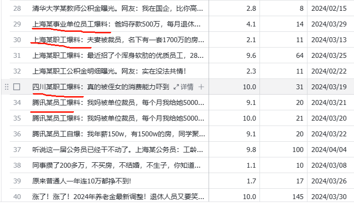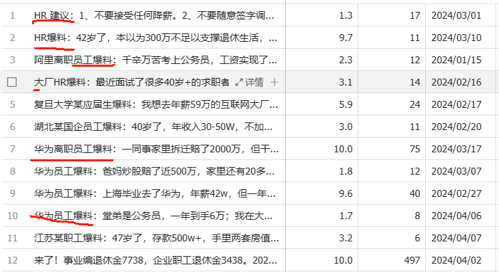 【爆料系列】:主要用HR爆料、某大厂爆料、某职工爆料、某员工等格式形成套路模板,观其所有文章,用大厂去爆料,效果明显很多,看来还是有”大厂效应“